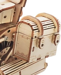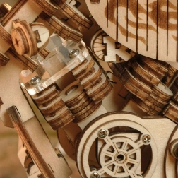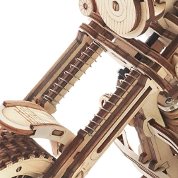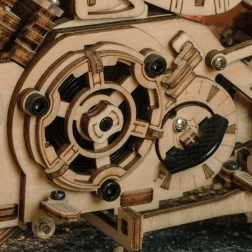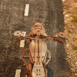 Ez a fa mechanikus motor remek választás mindenkinek, aki szereti a designt, a technikát és az igényes kézimunkát. A felhúzható rugós szerkezet elsütő karral lendületes haladásra készteti a modellt, míg a működő kormány részleges irányítást tesz lehetővé. A motor élethű járását szépen kiegészíti a dugattyúk mozgása és az első villa funkcionáló rugózása.