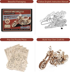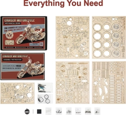 Fedezze fel a makettezés örömét ezzel a precíz 3D rétegeltlemez-motorkerékpár készlettel. A modell felhúzható rugós meghajtást, működő kormányzást, mozgó dugattyúkat és funkcionáló első felfüggesztést kínál. A 420 alkatrésznek és a közepes nehézségi szintnek köszönhetően 4–5 óra szórakozás vár; az összeszerelés után a motor képes önállóan haladni, továbbá dekoratív megjelenésével és az ülés melletti apró tárolórekeszekkel is lenyűgöz.