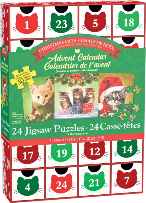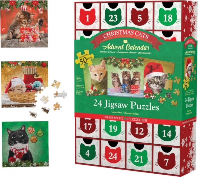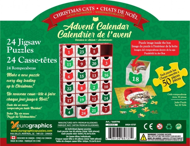 Rövidítse le a várakozást Szentestére az EUROGRAPHICS márka eredeti adventi naptárával. Belül 24 önálló mini kirakót talál karácsonyi cicás motívummal, mindegyik 50 darabból áll. A naptár újrahasználható fiókokkal rendelkezik, így az ünnepek után apróságokkal könnyedén újratölthető, és jövőre is használható.