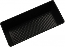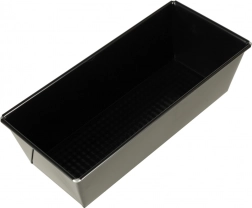 Ez a fekete, téglalap alakú forma alacsony széntartalmú acélból készült, tartós tapadásmentes bevonattal. A sima oldalfalak és a texturált alj kiváló hőeloszlást és könnyű kifordítást biztosítanak odragadás nélkül. A dróttal megerősített sarkok gyakori használat mellett is megtartják az alakot.