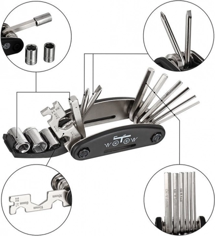 Tartalmaz 2–6 mm-es imbuszkulcsokat, 8/9/10 mm-es dugókulcsfejeket, kereszt- és lapos csavarhúzót, adaptert és küllőkulcsot a sokoldalú felhasználáshoz.