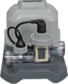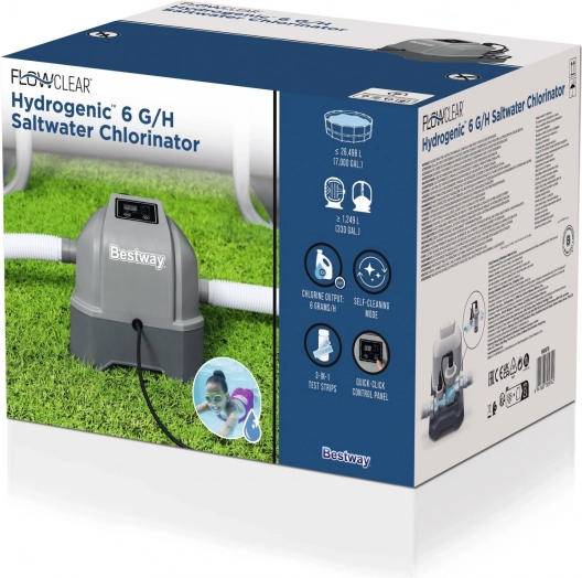 | Vízkezelő készülék fürdők számára, amely minden típusú vízforráshoz alkalmas. | - kompatibilis akár 7000 gal (26 498 l) térfogatú medencékkel, és legalább 330 gal (1249 l) átfolyást igényel, - a sót használja klór előállítására, amely tisztán tartja a medencét, ugyanakkor kíméletes a bőrhöz, a szemhez és a hajhoz, - könnyen kezelhető vezérlőpanel automatikus reteszelő funkcióval, - automatikus öntisztító üzemmód, - tartalmaz adaptereket a legtöbb medencéhez, - 50 tesztcsíkot tartalmaz, - klórkibocsátás 6 g/óra. | .