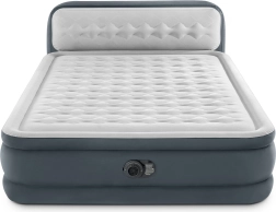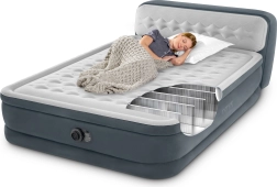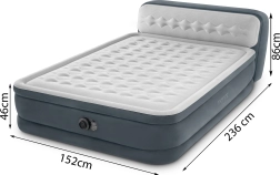 Kétszeres falú INTEX felfújható ágy Dura-Beam Fiber-Tech technológiával, nagy fekvőfelülettel, integrált háttámlával és beépített elektromos pumpával a gyors felfújáshoz és leeresztéshez. A padlótól mért 46 cm magasság és a puha velúr felület kényelmet, stabilitást és letisztult megjelenést biztosít. A 272 kg maximális teherbírás megbízható alvást nyújt két személy számára.