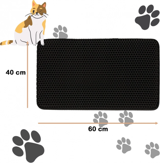 A bőkezű 40 × 60 cm-es méret a legtöbb macskaalom-típushoz illeszkedik. A csúszásgátló alsó réteg megakadályozza az elmozdulást még élénkebb ki- és belépéskor is. A karbantartás rendkívül egyszerű – elég felemelni, kiönteni, és szükség esetén leöblíteni vagy kiporszívózni.