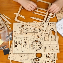 A ROKR Climber kézzel összeállítható golyópálya, lézerrel vágott fa elemekből. Az elegáns, központi „erődre” épülő konstrukció fogaskerekeket, tengelyeket és emelőmechanizmusokat használ, amelyek a golyókat gördülékenyen vezetik az átgondolt pályákon. A készlet fejleszti a műszaki gondolkodást, a képzelőerőt és a finommotorikát – miközben mutatós dizájndekoráció is.