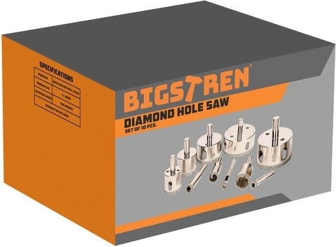 A BIGSTREN 10 darabos gyémánt körkivágó készlet a leggyakoribb víz-, gáz- és villanyszerelési méreteket fedi le: 6, 8, 10, 16, 20, 28, 35, 45, 50 és 68 mm. A gyémántbevonatnak köszönhetően a koronák kiváló élettartamot és maximális pontosságot biztosítanak, a járólapok széleinek lepattanása nélkül. Fúrhat vízhűtéssel a hosszabb élettartamért és a gyorsabb hőelvezetésért, illetve szárazon rövidebb szakaszokon.