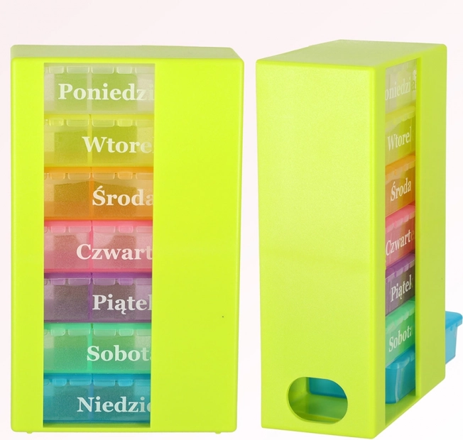 Heti tabletta szervező ideális segítő mindenki számára, aki szeretné áttekinteni gyógyszereit. Az 7 színes fiókra osztott szervező egyszerűsíti annak követését, mely nap melyik tablettákat kell bevenni.