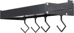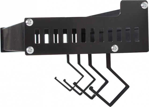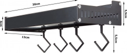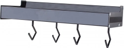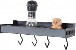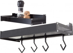 Ez a fali polc a minimalista megjelenést maximális funkcionalitással ötvözi. A porszórt alumínium ellenáll a nedvességnek és a korróziónak, így ideális a konyhába és a fürdőszobába is. A levehető kampókra felakaszthatja a törölközőket, merőkanalakat vagy kulcsokat, míg a felső tároló rész biztonságosan tartja a fűszereket, tégelyeket vagy kozmetikumokat.