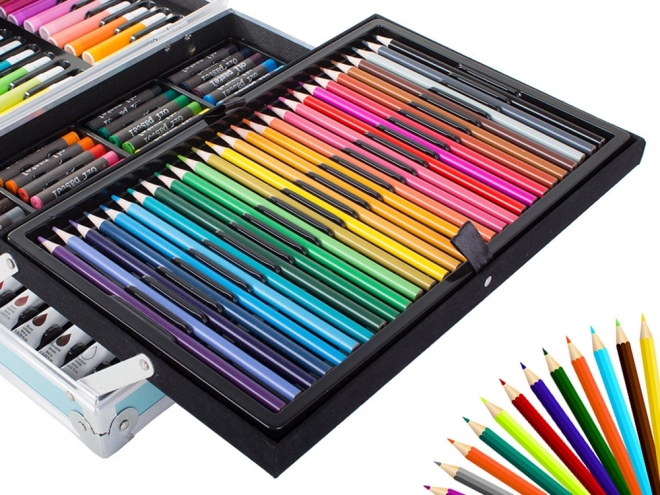 A készlet különféle eszközöket tartalmaz, amelyek áttekinthetően vannak elrendezve a speciális rekeszekben. A bőrönd stílusos dizájnjának köszönhetően művészeti eszközei mindig kéznél lehetnek.