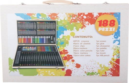 A készlet 188 különböző darabot tartalmaz, amelyek széles skálájú eszközöket biztosítanak kreatív kifejezéshez és a fantázia fejlesztéséhez.