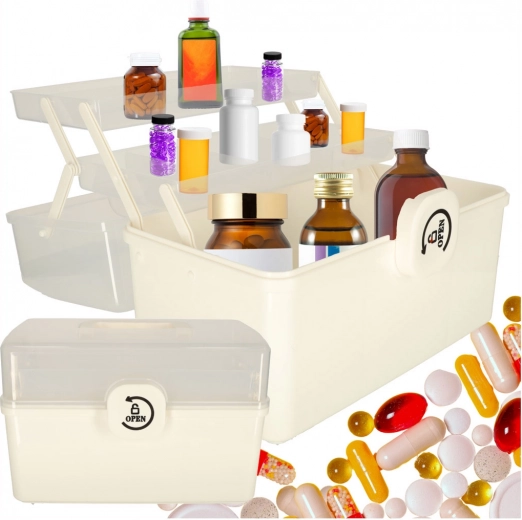Ez a nagy gyógyszeradagoló lehetővé teszi, hogy rendezze gyógyszereit és egészségügyi eszközeit könnyedén és áttekinthetően. Méretei 34 × 19 × 22,5 cm, elegendő helyet biztosítanak különféle gyógyszerek és egészségügyi termékek tárolásához.