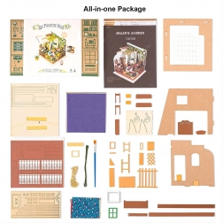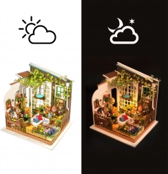 Ez a kifinomult DIY miniatűr kellemes, alkotó szabadidős élménnyé varázsolja az együtt töltött időt. A készlet előre kivágott rétegeltlemez elemeket, papírnyomatokat, textil- és fémalkatrészeket, festékeket és ragasztót tartalmaz. A LED világításnak köszönhetően minden részlet érvényesül, a kész modell pedig stílusos polcdísz vagy irodai dekoráció lesz.