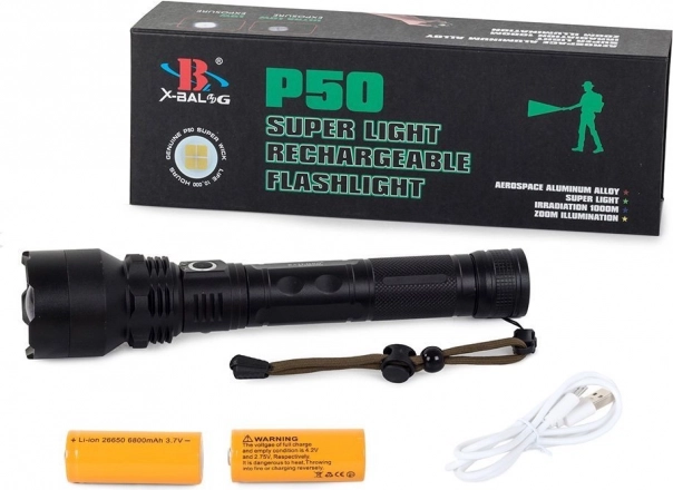 Erőteljes, taktikai BAILONG zseblámpa CREE XHP50 diódával, legfeljebb 1000 m fényhatótávval, fokozatmentes zoommal és 3 világítási móddal. A repülőgépipari alumíniumból készült, IPX5 védettségű, csúszásgátló felületű ház és a töltöttségjelző LED megbízhatóságot garantál terepen. A tápellátást 2× 26650 akkumulátor biztosítja, a kényelmes USB-töltés pedig egyszerű használatot kínál.