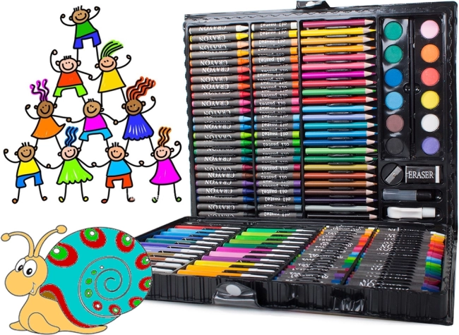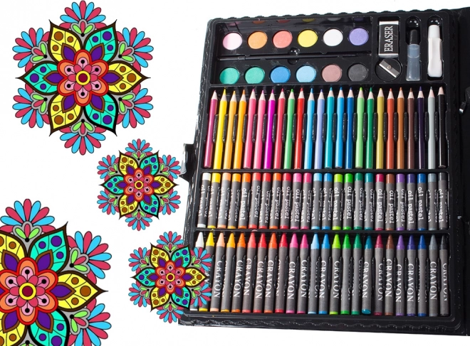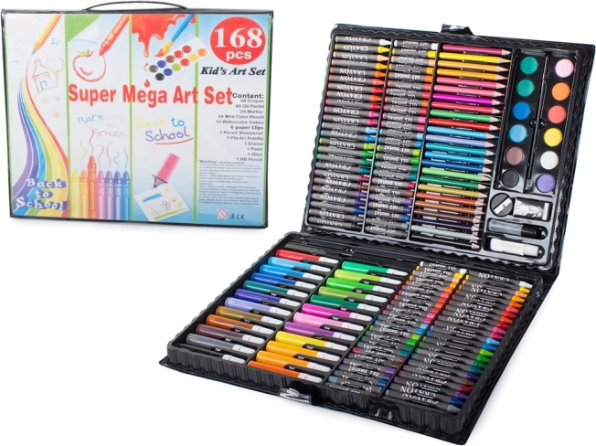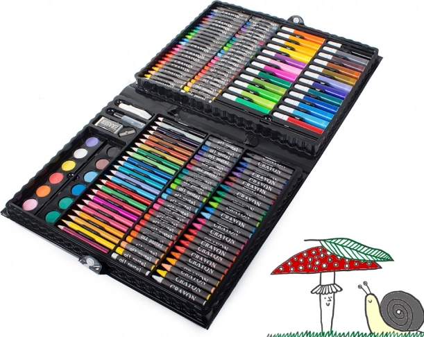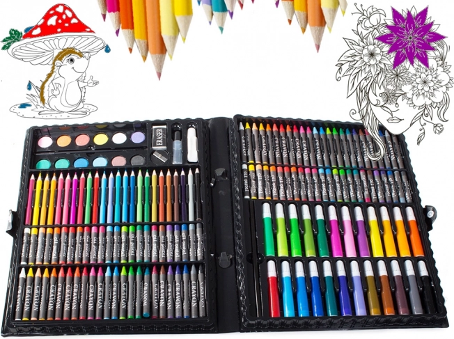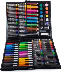 A színes ceruzáktól a filceken át egészen az akvarellfestékekig – 168 darab rajzoláshoz, színezéshez és festéshez, kényelmesen elrendezve az áttekinthető koff erben.
