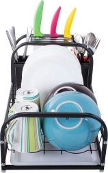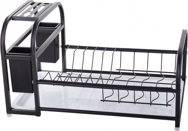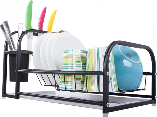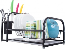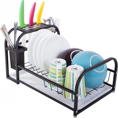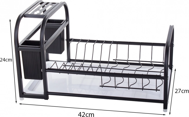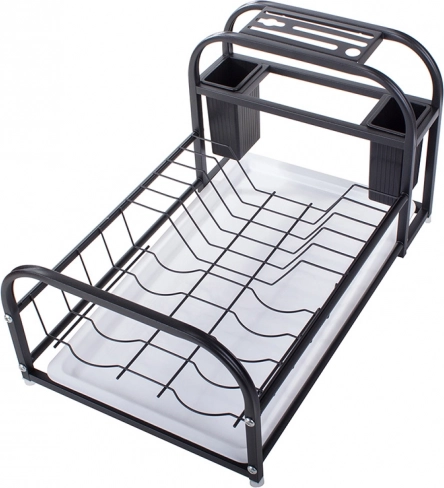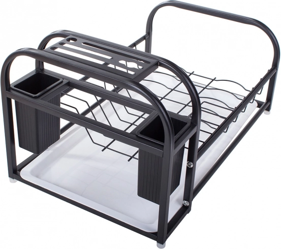 Ez a modern edényszárító a porszórt felületű masszív fémet tartós műanyag elemekkel ötvözi. Nedvesség- és sérülésálló, ezért kiváló a mindennapos használathoz a forgalmas konyhákban. A loft dizájn elegáns fekete színben könnyen illeszkedik bármely enteriőrbe, és funkcionális dísze lesz a munkalapnak.