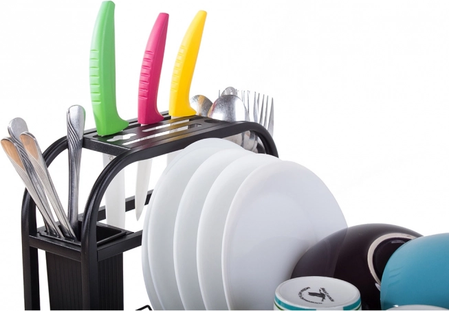 A függőleges rekeszek a tányérokhoz, két különálló edény az evőeszközöknek és egy praktikus késtartó mindent átláthatóan a helyén tart.