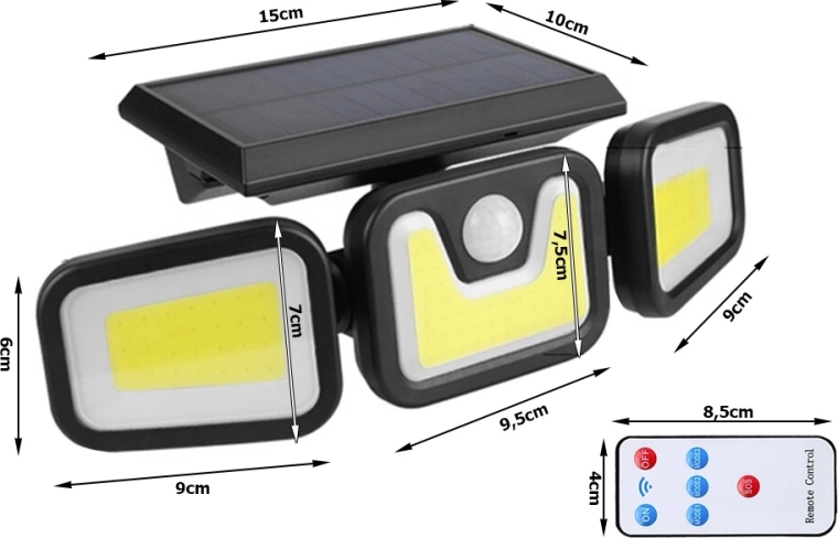 Megbízható napelemes lámpa COB/LED technológiával, amely fényes és energiatakarékos megvilágítást nyújt ott, ahol a leginkább szükség van rá. A beépített mozgás- és alkonyérzékelő csak akkor aktiválja a fényt, amikor szükséges, így energiát takarít meg és meghosszabbítja az üzemidőt. A három teljesen állítható panel lehetővé teszi a fény pontos irányítását a kívánt helyre.