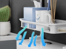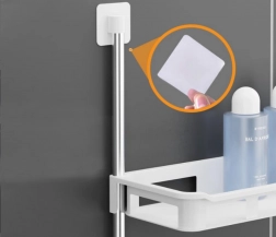 A szerelés gyors és intuitív – az állványt egyszerűen a falhoz rögzíti a mellékelt kapcsokkal. A moduláris megoldásnak köszönhetően 1–3 polc is használható, a magasság és az elrendezés igény szerint alakítható. Négy akasztó is rendelkezésre áll a fürdőszobai kellékek felakasztásához.