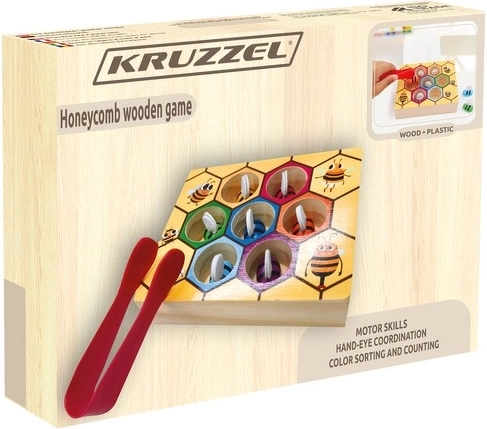 Fedezze fel a legkisebbeknek szánt okos és szórakoztató játékot: a KRUZZEL fa méhsejtjét csipesszel és színes méhecskékkel. A gyerekek csipesszel megfogják a méhecskéket, és a megfelelő hatszögekbe helyezik őket, így fejlesztik a finommotorikát, a szem–kéz koordinációt és a színek felismerését. A biztonságos fa kivitel és a kompakt méretek otthonra és útra egyaránt ideálisak.