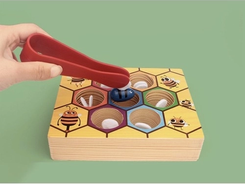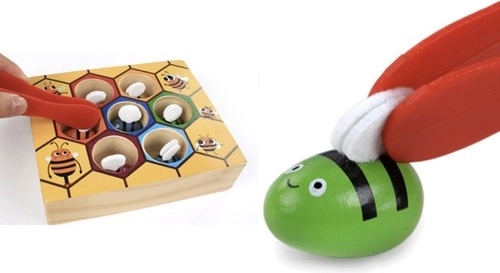 A méhecskék szárnyainak megfogása csipesszel erősíti az ujjakat, javítja a fogást és a szem–kéz koordinációt. Szórakoztató kihívás, amely pontosságra és türelemre tanít.