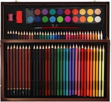 Kreatív művészeti készlet tökéletes megoldás mindazoknak, akik szeretnek alkotni. A praktikus fa toknak köszönhetően minden segédeszköz áttekinthetően el van rendezve és mindig használatra kész.