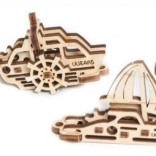 A négy mini Ugears modell készlete kellemes alkotást és játékos mechanikus funkciókat kínál zsebméretben. A huroknak köszönhetően könnyen egyedi kulcstartóvá vagy hátizsákdísszé alakíthatók. Minden hajónak saját egyszerű fogaskereke van, amely rövid pihenők során nyújt szórakozást.
