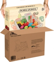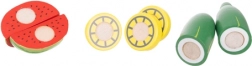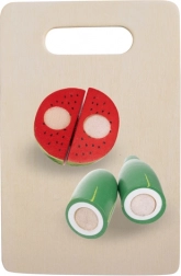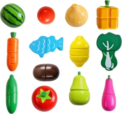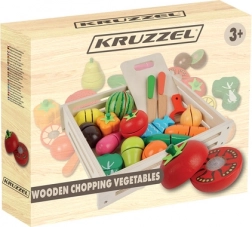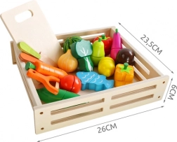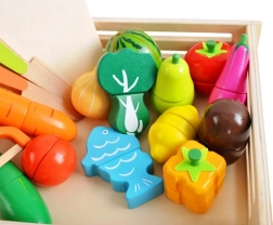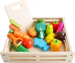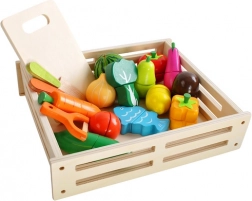 Színes, fából készült gyümölcs- és zöldségkészlet praktikus ládában, amely valósághű játékot kínál a konyhában, boltban és főzés közben. Az elemek a tépőzáraknak köszönhetően könnyen „felvághatók” és újra összeilleszthetők, a készletben található 2 kés, egy vágódeszka és egy hámozó utánzat is. A játék fejleszti a finommotorikát, a képzelőerőt, valamint a színek és az élelmiszerek neveinek elsajátítását.