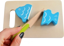 A darabolt gyümölcsök, zöldségek és a hal a tépőzáraknak köszönhetően könnyen „vághatók” a fából készült késsel, majd ismét összeilleszthetők. Remek finommotorika-gyakorlat és szerepjáték.