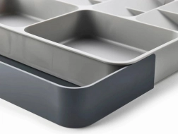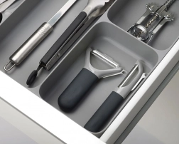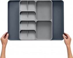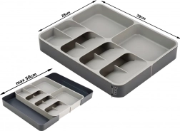 A konyhai fiókszervezőt úgy tervezték, hogy maximalizálja a teret és biztosítsa az áttekinthető elrendezést az evőeszközei és konyhai eszközei számára. A bővíthető kialakítása révén alkalmazkodik a különböző fiókméretekhez.