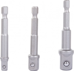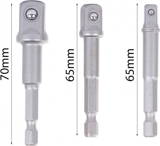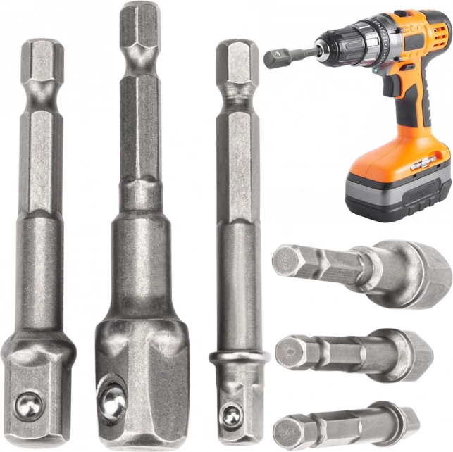 A készlet három adaptert tartalmaz, amelyek tartós acélból készültek, ami hosszú élettartamot garantál. Az adapterek lehetővé teszik a csavarhúzó használatát különböző méretű fejekkel.