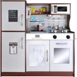 Stílusos fa XL játékkonyha, amely a LED háttérvilágításnak, a tekerőgombok kattogó hangjának és a gazdag tartozékkészletnek köszönhetően valósághű főzőjátékot kínál. Masszív fa szerkezet, modern megjelenés és funkcionális részletek, mint a sütő, mikrohullámú sütő, tűzhely és kivehető mosogató, amelyek támogatják a kreativitást és a finommotorika fejlesztését.