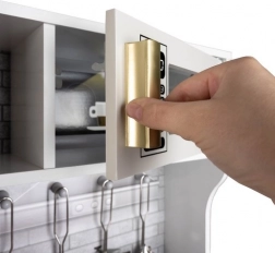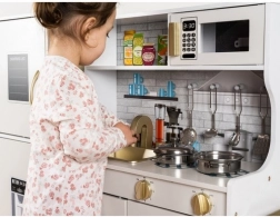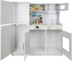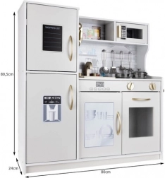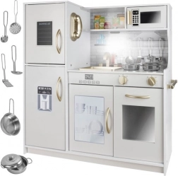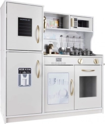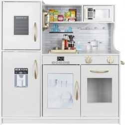 Ez az XL fa játékkonyha hosszú órákon át tartó szórakozásra készült. A beépített LED világítást szabadon elhelyezheted a szekrény alatt, a szekrényben vagy a sütőben, a forgatható, kattanó kapcsolók pedig még valóságosabbá teszik a főzést. A masszív MDF szerkezet és az elegáns fehér–arany kivitel a gyerekszoba dísze lesz.