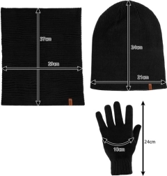 Komplet tartalmaz egy fekete sapkát, sálat és kesztyűt, mind akrilból készült, ideális a téli hónapokra.