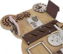 - Finommotoros képességek fejlesztése: Az interaktív elemek, mint a zárak, fogaskerekek vagy cipőfűzők segítik a kéz-szem koordináció javítását.