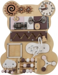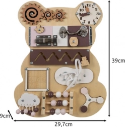 Lépjen be a szórakozás és a tanulás világába a fa érzékszervi táblával, amely Kruzzel mackó formájában készült. Ez a tábla úgy lett tervezve, hogy támogassa gyermeke finommotoros képességeit és kognitív fejlődését.