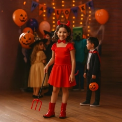 Stílusos ördögjelmez élénk piros színben, amely egy szempillantás alatt átalakít gyermeket és felnőttet egyaránt. A puha anyagoknak és a rugalmas rögzítéseknek köszönhetően a kiegészítők könnyen felvehetők, és kellemesen a helyükön maradnak a buli teljes ideje alatt. A szett ideális otthoni szerepjátékhoz, iskolai műsorokhoz, fotózáshoz és bulikhoz.
