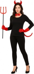Teljes ördögjelmez gyerekeknek és felnőtteknek 4 kiegészítővel: pántos szarvak, masni, farok és szigony. Univerzális méret rugalmas gumikkal a kényelmes viseletért. Remek választás Halloweenre, farsangra, születésnapi bulira vagy tematikus eseményekre – pillanatok alatt feltűnő és vidám jelmezt varázsolhatsz.