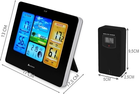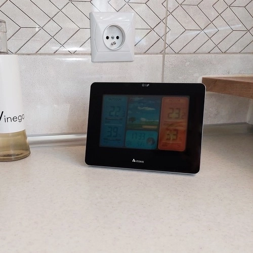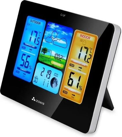 A modern, vezeték nélküli IZOXIS időjárás-állomás színes és jól olvasható LCD-kijelzővel beltéri és kültéri hőmérsékletet és páratartalmat mér, megjeleníti a légnyomást, az időjárási trendeket és a Hold fázisait. A külső szenzor akár 60 m-es hatótávjának köszönhetően megbízható áttekintést kap a ház körüli körülményekről. Nem hiányzik a 12–24 órás előrejelzés, a hőmérsékleti riasztás, a óra és dátum, valamint a praktikus háttérvilágítás a könnyű olvashatóságért nappal és éjjel.