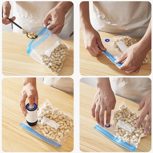 A vákuumszivattyú működése egyszerű – helyezze az élelmiszert a cipzáras zacskókba, és a gomb megnyomásával szívja ki a levegőt. Az így csomagolt élelmiszerek remek módot kínálnak arra, hogy útközben is frissen tartsa készleteit.