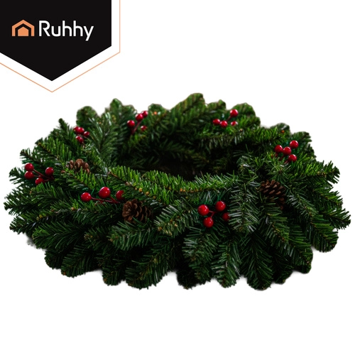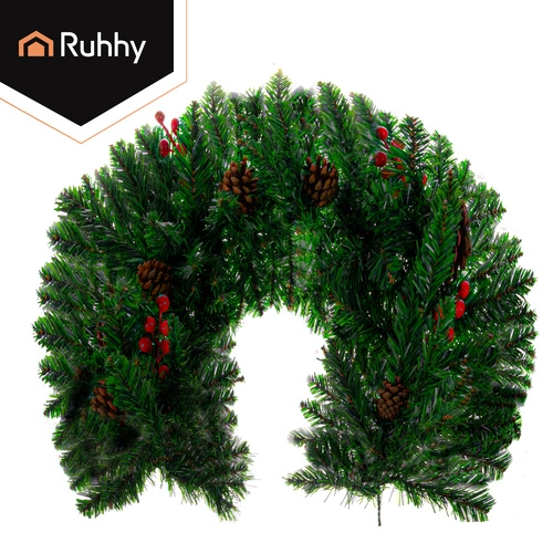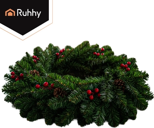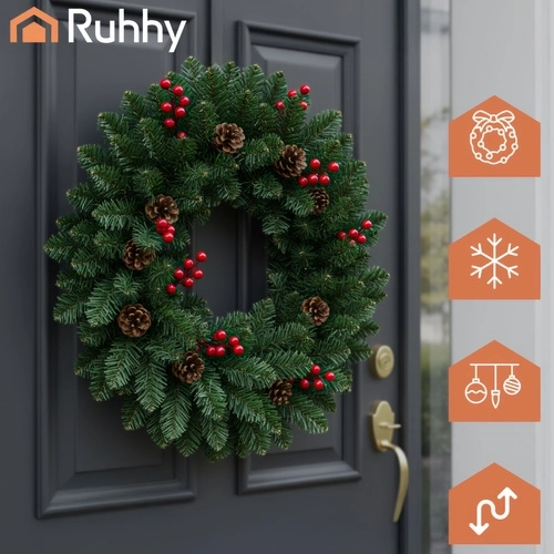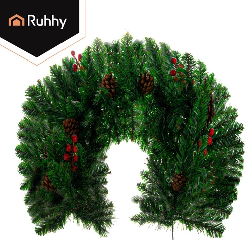 A zöld tűlevelek, piros bogyók és természetes hatású tobozok elegáns kombinációja karakteres ünnepi dekorációt teremt ajtókra, falakra és párkányokra.