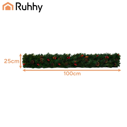 Stílusos 1 m-es karácsonyi girland sűrű PVC tűlevelekkel, ideális ajtók, erkélyek, korlátok és oszlopok díszítésére. Rugalmasságának köszönhetően könnyedén a kívánt formára alakítható – az egyenes szegélyezéstől a többrétegű kör dekorációkig. A beépített tobozok és piros bogyós ágacskák természetes, elegáns megjelenést kölcsönöznek.