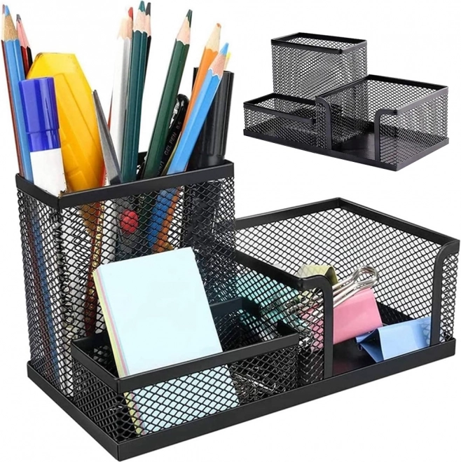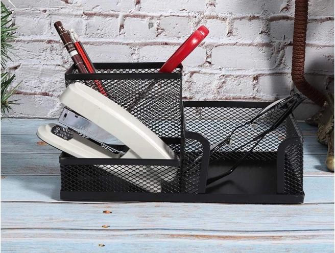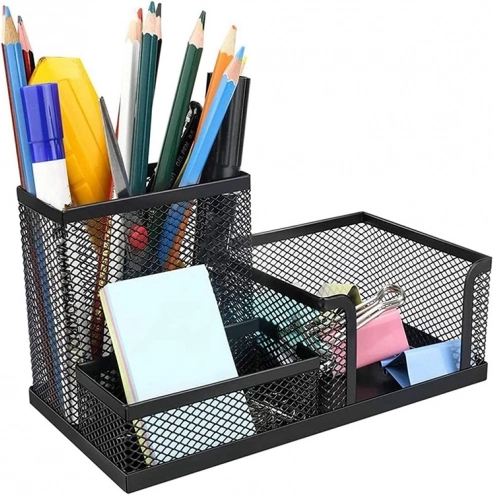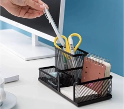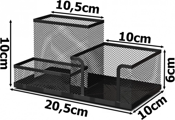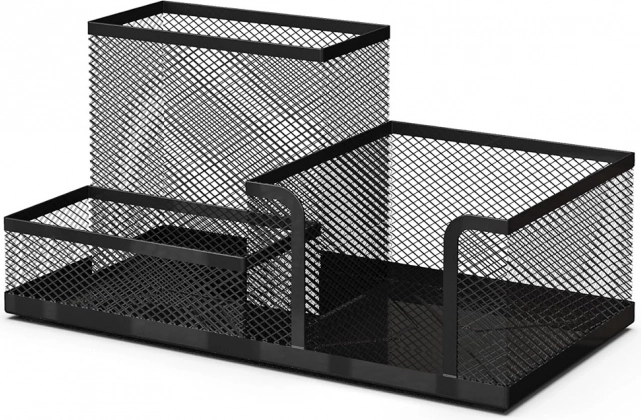 Fedezze fel a rendszerezés előnyeit fekete hálós asztali rendezőnkkel. Könnyű, de tartós fémszerkezete úgy lett tervezve, hogy munkaterülete tiszta és hatékony maradjon. A három tágas rekesz segít rendszerezni minden irodai kelléket, így Ön teljes mértékben a munkára koncentrálhat és növelheti termelékenységét.