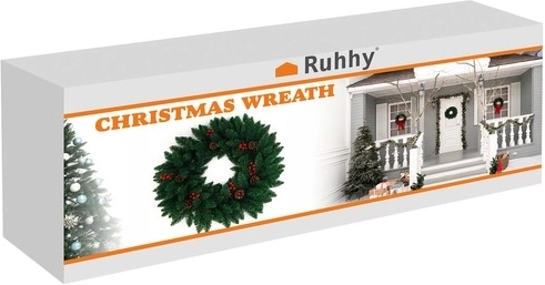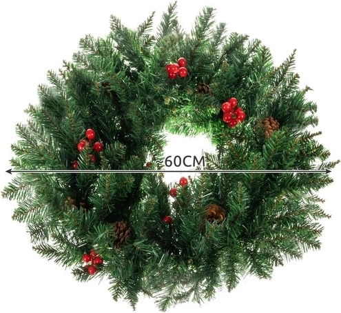 Stílusos design - a műkarácsonyi koszorú remek kiegészítő bármilyen térbe. Segítségével egyedi kompozíciókat alkothat nemcsak a nappaliba, hanem az előszobába vagy a bejárati ajtóra is. A koszorú műtobozokkal és vörös bogyókkal díszített ágacskákkal van ellátva.