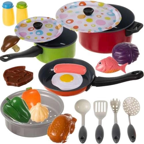 - Nagy szett: A szett minden szükséges eszközt tartalmaz, hogy a gyerekek finom ételeket készíthessenek a család számára. Tartalma: fazék, serpenyő, fedők, párolóbetét, merőkanál, és még sok más kiegészítő.
