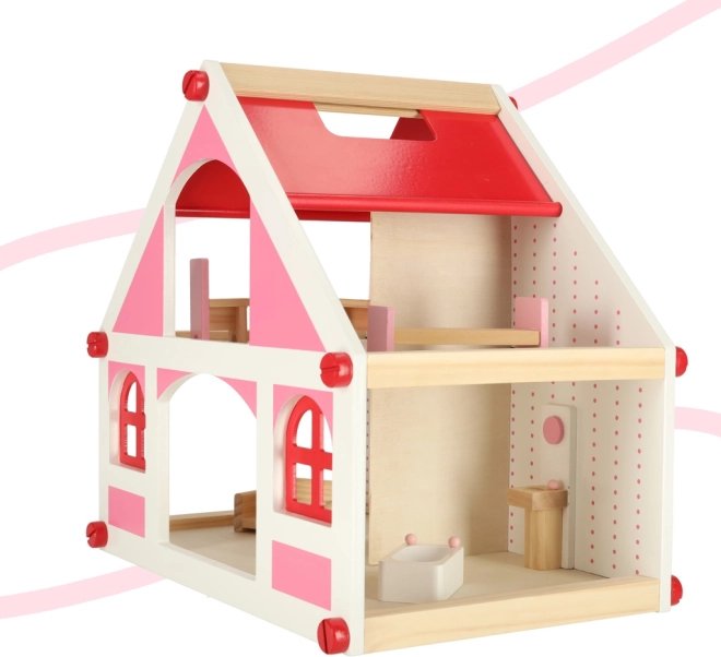 Aranyos, rózsaszín-fehér kivitelű fa babaház, amely órákon át tartó kreatív játékot kínál. Két emeletes, nyitható ablakokkal és ajtóval, valamint teljes bútorkészlettel szállítva (kád, kanapé, fotel, két szék, mosdó, ágy és asztal). A simára csiszolt fa biztonságos játékot garantál, az összeszerelés pedig egyszerű a mellékelt csavaroknak és csavarhúzónak köszönhetően.