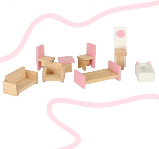 A csomag része egy gazdag, fa bútorkészlet lágy rózsaszín árnyalatokban, így azonnal berendezhető a nappali, a fürdő és a hálószoba. A móka már a közös összeszerelés során elkezdődik – az összerakás egyszerű, és minden szükséges elem a csomagban található.