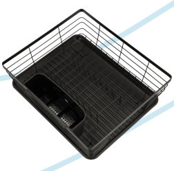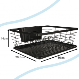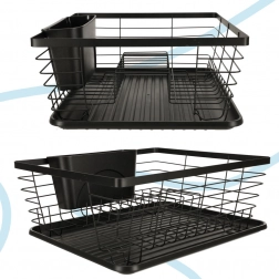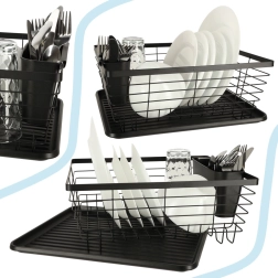 Stílusos fekete edényszárító, amely ötvözi a modern dizájnt és a praktikusságot. Nagy kapacitást kínál, külön evőeszköztartóval és csepegtetőtálcával, amely szárazon és tisztán tartja a konyhapultot. Masszív fém szerkezet műanyag tálcával a hosszú élettartamért és a könnyű karbantartásért.