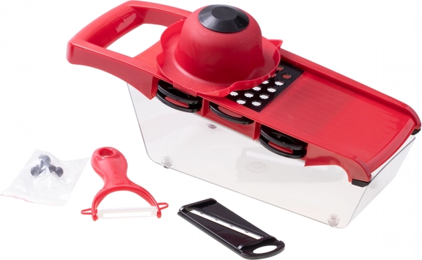 - Hat cserélhető penge: 2 Julienne-hez (3 mm és 4 mm), 2 szeleteléshez (1.0 mm és 1.5 mm), finom reszelőél és hullámos vágópenge.
