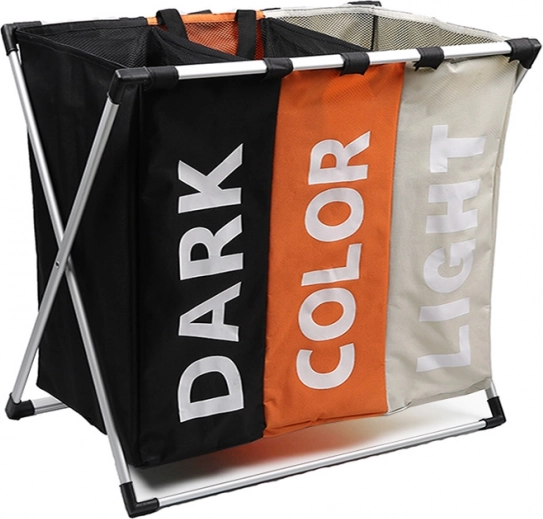 Háromrekeszes szennyeskosár háromszínű dizájnnal, praktikus segítőtárs minden háztartásban. A kosár három, külön-külön zárható rekesszel rendelkezik a szennyes szétválogatásához, mindegyik jelöléssel ellátva és vízálló anyagból készülve, ami tartósságot és kényelmes használatot biztosít.