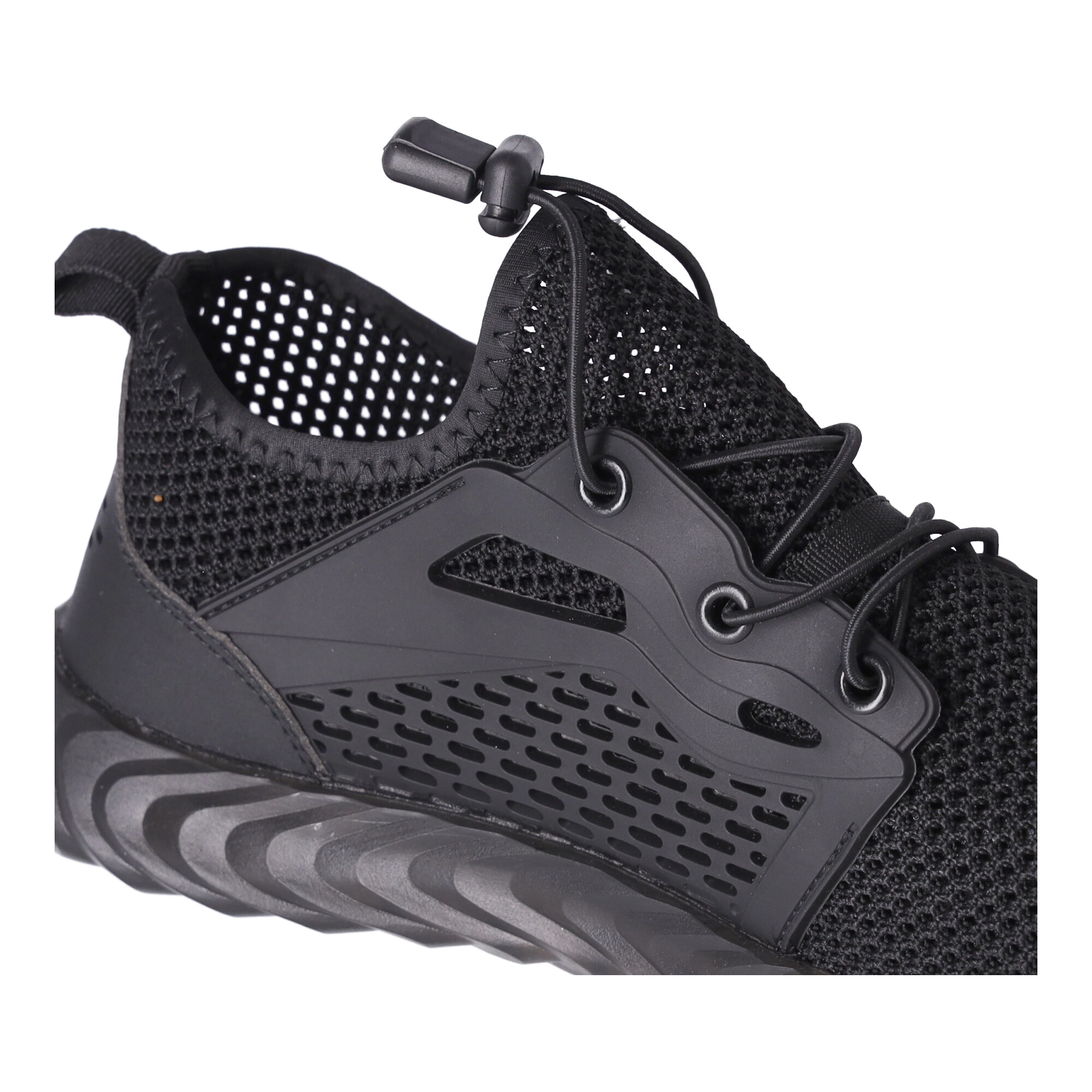 Az acél orrmerevítő és az átszúrásálló köztes talp megbízható védelmet nyújt az ujjaknak és a talpnak. A csúszásgátló mintázatú gumi talp növeli a stabilitást és segít megelőzni az elcsúszást. Az elasztikus gyorsfűző csökkenti a felvétel idejét, és stabilan a helyén tartja a lábat.